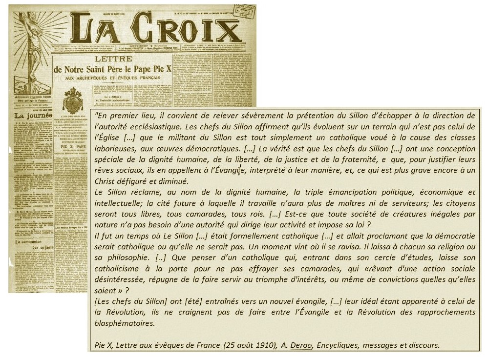 En 1905, l’Assemblée nationale vote la loi de séparation de l’État et de l’Église. Le Sillon et ses idées libérales sont dès lors mal vus par le nouveau pape Pie X. Celui-ci se méfie de l’idéologie émancipatrice du mouvement et de sa tendance à aplanir les distinctions sociales. Le 25 août 1910 le pape adresse au Sillon un ferme rappel à l’ordre qui paraît dans « La Croix ».