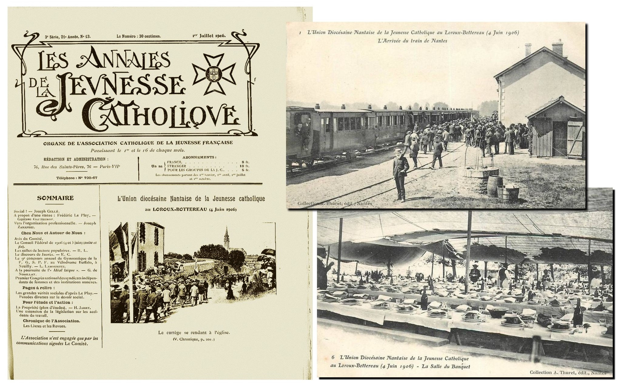 A la même époque existe déjà l’association catholique de la Jeunesse Française qui édite » les annales de la jeunesse catholique française » (voir ci dessous). Si elle se réfère au christianisme social, elle est d’abord un mouvement d’Église et est d’essence plus conservatrice. Elle est présente dans le monde rural et sur le territoire Nantais. En témoigne ces 2 cartes postales faisant mémoire d’un rassemblement le 4 juin 1906 au Loroux-Bottereau. On peut penser qu’Auguste et ses amis y ont participé.