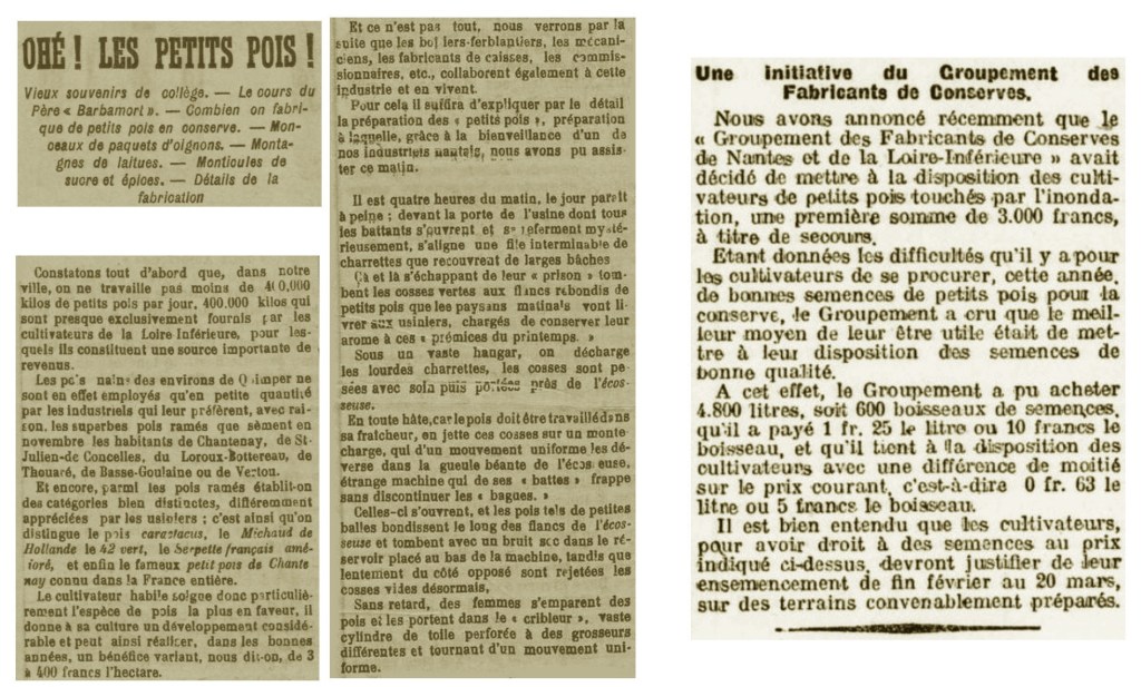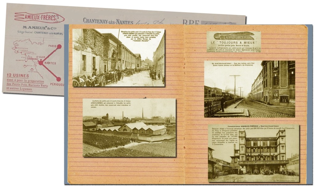 En effet à la fin du 19ème siècle Chantenay, cette commune proche de Nantes, avant qu’elle soit annexée en 1908, était un centre renommé pour la culture des légumes. Cette localité a donné son nom à une variété de petits pois aujourd’hui très répandue et très appréciée en ce début de siècle. De plus, le débouché nouvellement créé par l’installation des premières usines de conserves, en particulier l’entreprise Amieux, n’a fait qu’activer l’extension de la culture des pois, production devenue insuffisante pour satisfaire à la fois le marché local, la demande parisienne et l’approvisionnement de la conserverie nantaise.