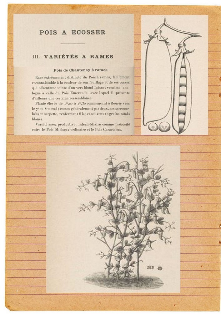 C’est à la Sainte-Catherine de l’année précédente, le 25 novembre 1911, que la famille a semé de grands morceaux de terre en petits pois. Dans son cahier, Auguste note que la variété utilisée, le pois de Chantenay, « est bien adaptée au milieu naturel. Cette variété se montre résistante à l’hiver et productive. En année normale on compte en effet jusqu’à 12 étages de fleurs. Son principal intérêt réside dans la qualité du pois qu’elle fournit, celui-ci est sucré et recouvert d’une cuticule fine et résistante… Il est particulièrement apprécié tant pour la fabrication des conserves que pour la consommation directe. C’est ainsi que le pois de Chantenay fait prime sur le marché parisien».