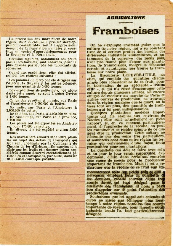En juillet, s’appuyant sur des extraits de presse découpés dans le journal quotidien, Auguste note dans son cahier que le bilan du marché des légumes a été plus que moyen cette année : « les petits pois sont depuis longtemps finis de ramasser, mais le prix élevé auquel ils se sont maintenus est lié à une récolte moyenne. Voici une semaine qu’il y a des haricots à ramasser mais ils sont déjà à bas prix à cause de la chaleur qui les amène trop vite. En revanche la vigne est toujours magnifique, la floraison est achevée et il y a très peu de mildiou ». Plus loin il ajoute : « J’ai évoqué avec papa la possibilité de se diversifier et de créer des cultures de framboisiers, il y a de la demande avec une biscuiterie nantaise qui fabrique de « la paille d’or ». Pourquoi pas, m’a-t-il répondu ! On fera des essais à ton retour du régiment ».