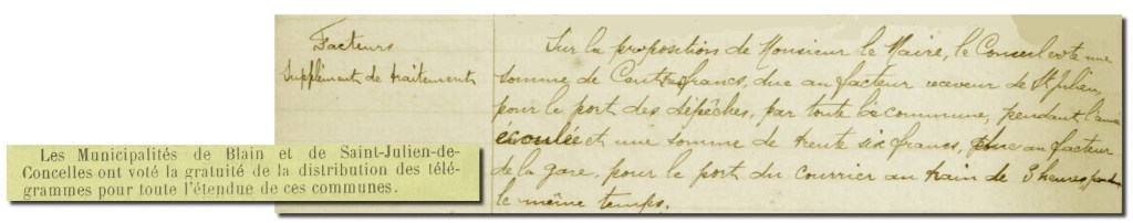 En 1910 le travail ne manque pas au bureau de poste d’autant que la municipalité a pris la décision de la gratuité de la distribution des télégrammes. Les Concellois ne se privent pas alors d’utiliser ce service qui doit donner lieu ensuite à une indemnisation de la commune aux services de la poste.