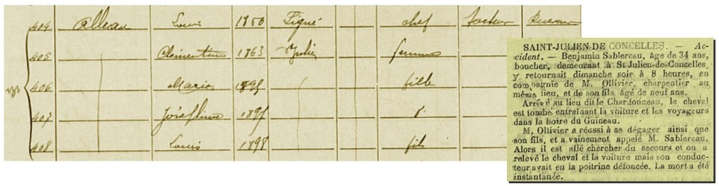 Ce qui a soudé Gabrielle et les deux Marie, c’est également de partager la perte de l’être cher. Comme Gabrielle, Marie COURGEAU a perdu son père, Armand le tailleur du bourg, à l’âge de 42 ans en 1900. Marie ALLEAU, l’aînée d’une fratrie de trois enfants, avait 7 ans quand sa maman est décédée. Son père s’est remarié deux ans plus tard en 1904 avec une épicière nantaise Clémentine SABLEREAU, sœur de Benjamin, le boucher et voisin d’en face, qui décèdera d’ailleurs tragiquement trois ans plus tard.