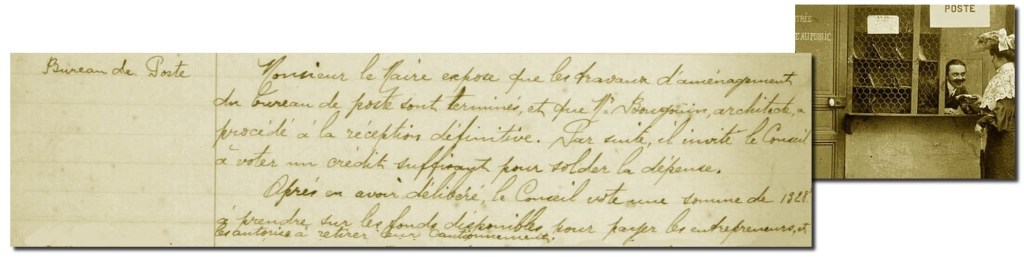 En 1911 l’arrivée du téléphone et les services bancaires assurés par la poste obligent à des travaux d’amélioration de son aménagement intérieur. Là encore c’est la mairie qui investit pour accueillir une clientèle de plus en plus large et demandeuse de services postaux, téléphoniques ou bancaires.