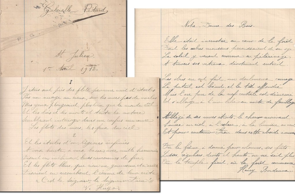 Gabrielle, de son côté, aime lire et ré-récrire dans son cahier d’écolier des récits ou poèmes de ses auteurs préférés comme Victor Hugo, François Coppée, Henry Bordeaux, Théodore Botrel et Jean Rameau.
