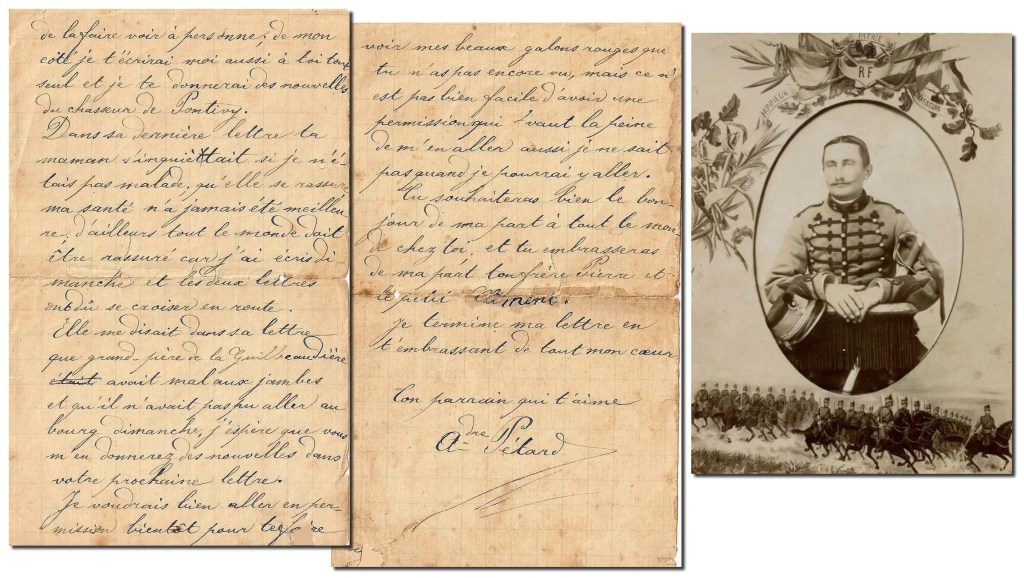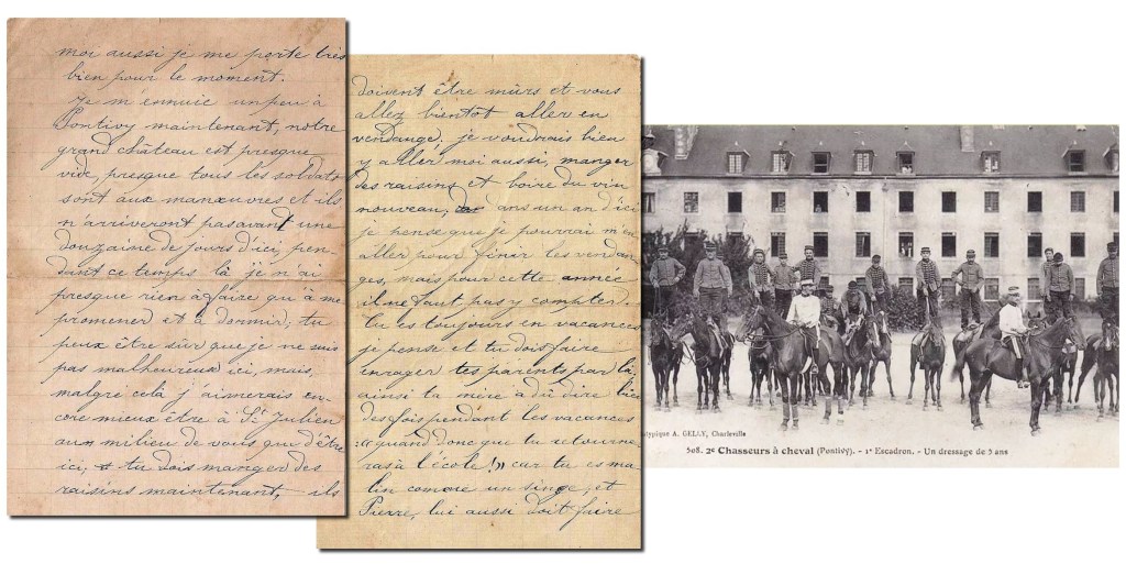 Les deux hommes s’apprécient. Leurs échanges de courriers ont débuté quand Alexandre a fait son service militaire à Pontivy dès 1900. Il avait alors 20 ans et Auguste 8. Pendant ces presque 3 ans de service, de novembre 1899 à septembre 1902, Alexandre évoque son activité au 2ème régiment de chasseurs de Pontivy et sa nostalgie de la Guilbaudière.