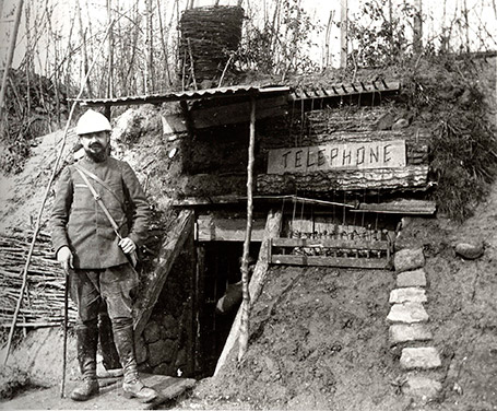 « Nous sommes dans un abri blindé bien recouvert de terre et de trois couches successives de gros troncs d’arbre près de nos pièces à 5 km environ des premières lignes “boches”. Je suis là comme Grand Directeur d’un service central téléphonique à 12 directions sans compter les branchements…