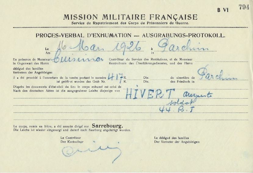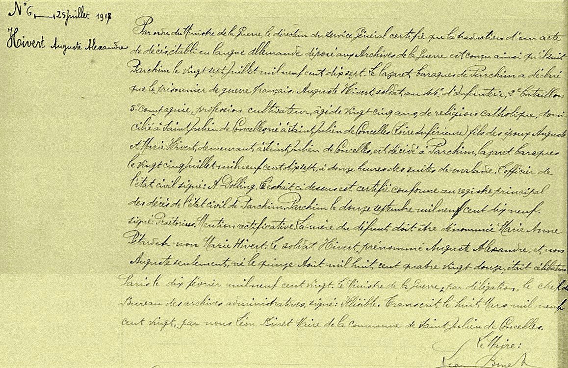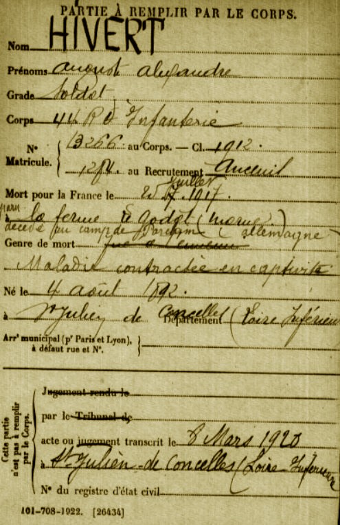 … puis « tué à l’ennemi » ainsi qu’il est noté sur le document originel établi par son corps d’armée attestant qu’il est « Mort pour la France ». Mais cette fois avec le matricule N° 13 266 du 44 ème régiment d’infanterie dans lequel il a été transféré en octobre 1915. Sur ce document, en marge, est ajoutée la mention « disparu »… à la Ferme du Godat, puis décédé au camp de Parchim, la date du décès étant bien notée au 25 juillet 1917. La mention « tué à l’ennemi » est ensuite rayée à l’item « genre de mort » et remplacée par « maladie contractée en captivité ».