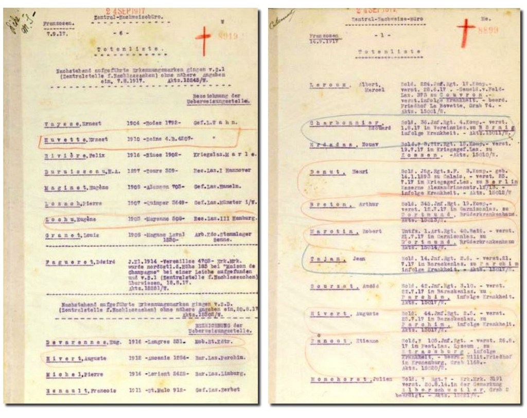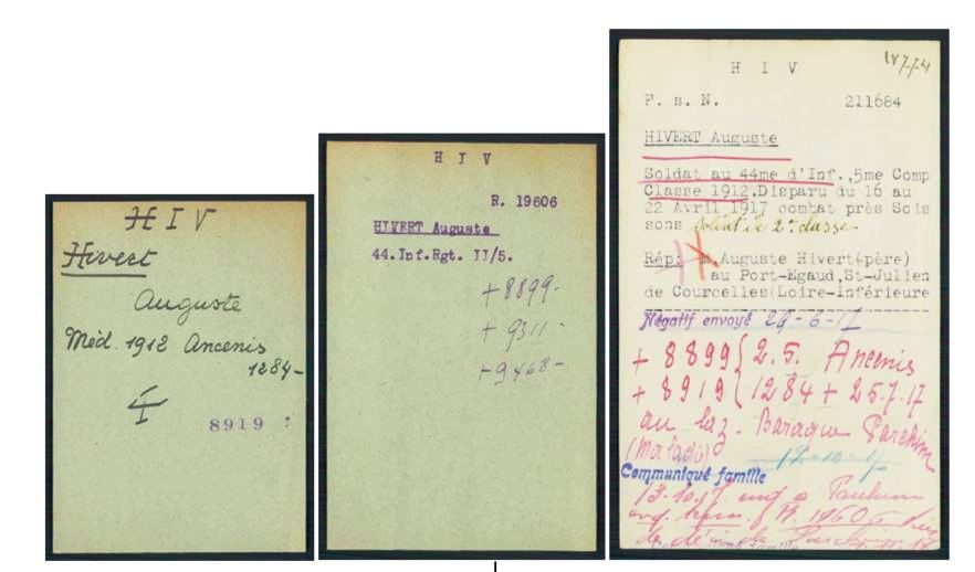 Les seuls renseignements que nous avons pu obtenir se trouvent sur le site du Comité international de la Croix rouge. Ces 3 documents au nom d’Auguste Hivert indiquent des numéros de référence qui se recoupent mais dont on ne savait à quoi ils correspondaient: 8899, 8919, 9311, 9468, R.19606.