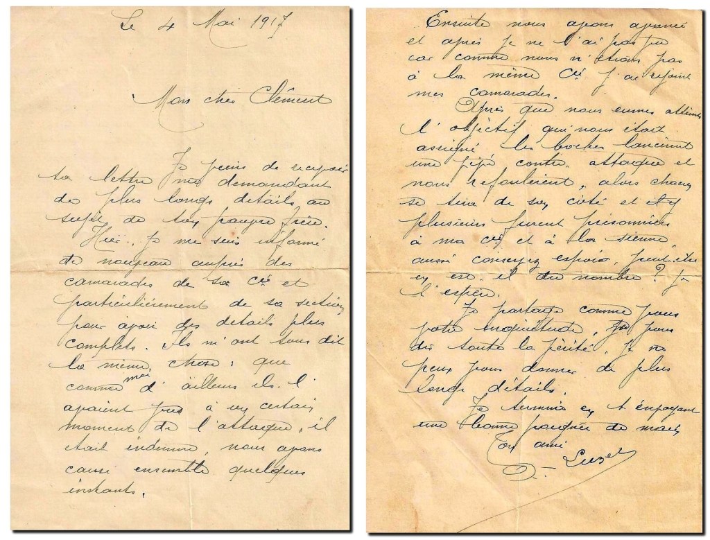 Clément décide alors d’écrire alors à plusieurs camarades de Saint Julien du même régiment … Le 4 mai 1917, il reçoit une réponse d’Alphonse LUZET, originaire du village de Boire-Courant, de deux ans le cadet d’Auguste et qui, comme lui, a été affecté tour à tour aux 77ème, 135ème et 44ème régiments d’infanterie.