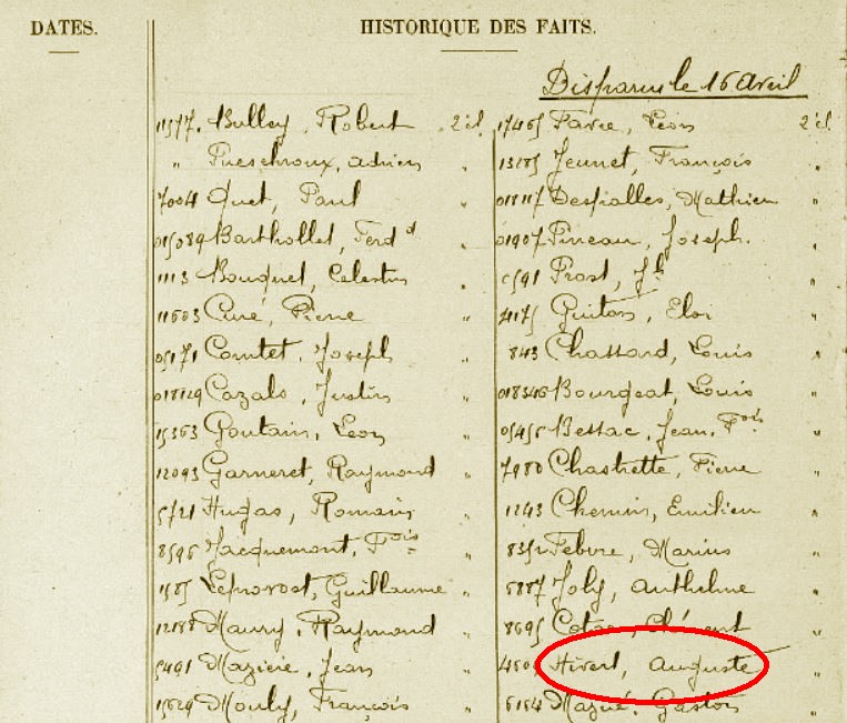 Outre le commandant VERGNE, le lieutenant du 1er peloton du 44ème RI, Gustave MAITREHENRY, né le 30 juin 1892 à Bugeat, décèdera également le 16 avril 1917 à la Ferme du Godat à Hermonville dans la Marne, à 24 ans, le même âge qu’Auguste.
