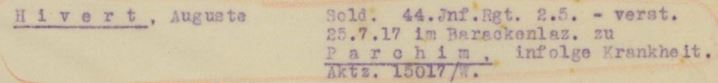 Le 3ème document est le plus intéressant car il répond à une demande d’enquête de la famille à la suite d’une première demande sans réponse datée du 29 juin 1917. Dans les listes de prisonniers décédés établies par les Allemands et transmises à la Croix Rouge, le nom d’Auguste Hivert et les circonstances de sa mort sont inscrits pour la première fois le 7 septembre 1917, puis le 14 septembre. La nouvelle de son décès en captivité semble avoir été communiquée à la famille entre le 13 octobre et le 1er novembre 1917, peut-être d’ailleurs accompagnée de la photo de sa sépulture dans le cimetière militaire de Parchim.