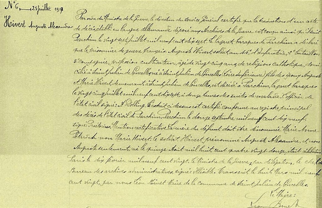 Le vœu d’Alexandre ne se réalisera pas ! Auguste est décédé quelques jours plus tôt, le 25 juillet 1917 au camp de Parchim[1].