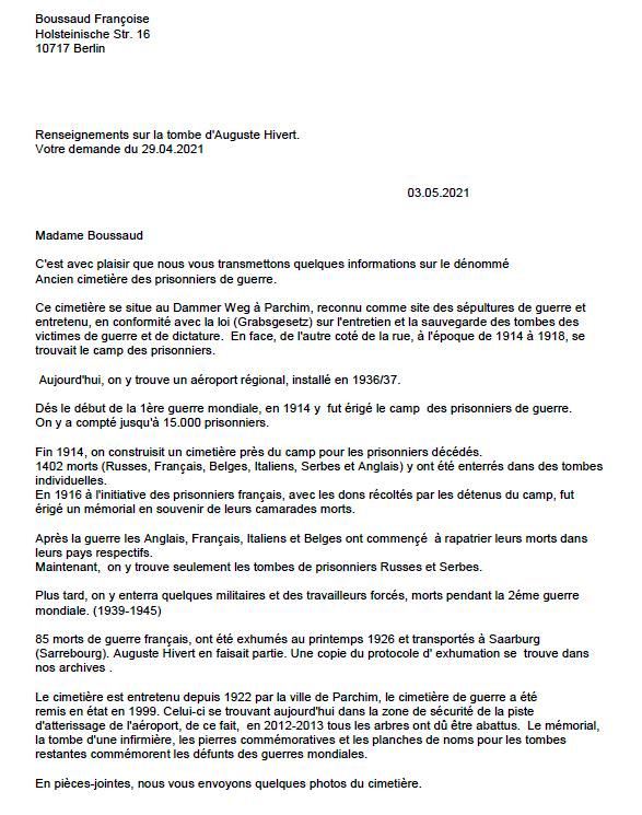 Nous décidons alors d’interroger la Ville de Parchim, mais comme nous ne maîtrisons pas la langue allemande, nous sollicitons Françoise BOUSSAUD, une amie de jeunesse, fille de Pierre et Gemma BOUSSAUD ex-concellois, pour faire l’intermédiaire. Françoise habite à Berlin et elle accepte gentiment de nous rendre ce service. Assez rapidement elle obtient une réponse précise et détaillée avec lettre et photos du site du cimetière à l’appui.
