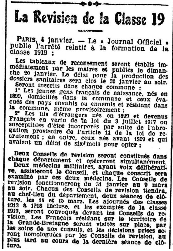 Dans le quotidien le phare de la Loire du 5 janvier 1918, Clément apprend que le vendredi 28 décembre 1917, la Chambre des députés a voté l’appel anticipé de la classe 1919 pour le printemps 1918, soit une année avant la date théorique d’incorporation. Le journaliste conclut par cette phrase : « Le président du Conseil, Georges Clemenceau y est plutôt favorable puisqu’il table toujours sur une conclusion du conflit si possible à la fin de l’année prochaine et tient à ce que tous les moyens humains et matériels soient donnés aux armées ».