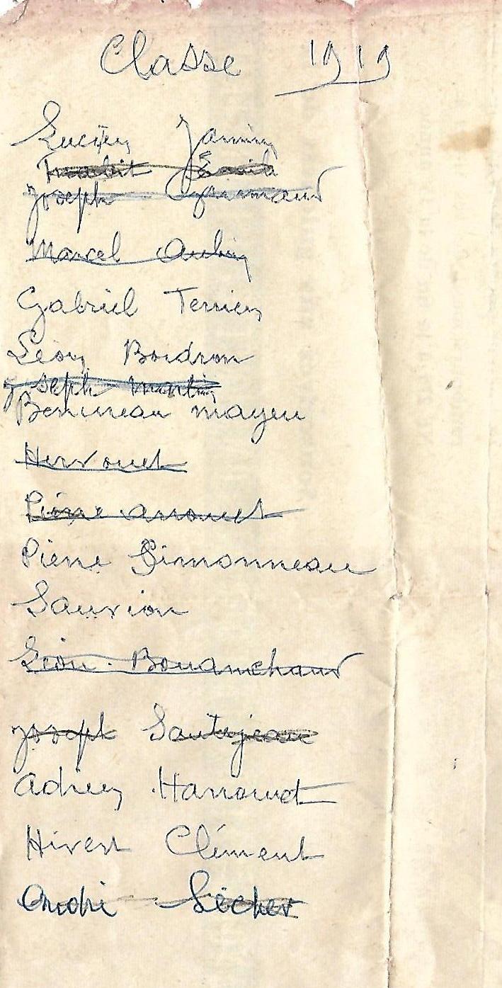 Notre grand père Clément dans les années 1930 a établi la liste de ses conscrits de la classe 1919 habitant toujours St Julien. Au fil des années il rayait le nom des disparus… Nous l’avons retrouvé récemment dans un vieux portefeuille…