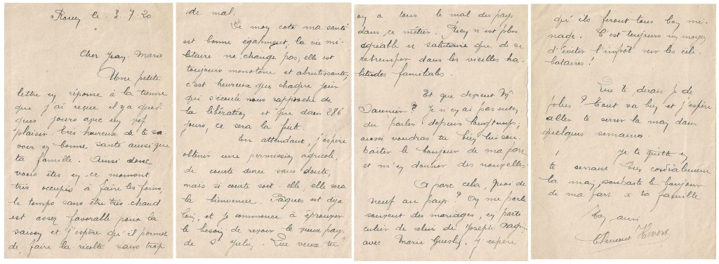 Dans cette caserne, Clément s’ennuie. Entre les exercices journaliers, Il lit et envoie des lettres à ses amis et parents, à Auguste Saunier, son ami prêtre installé désormais à Chantenay près de Nantes. Il reçoit aussi des nouvelles de Saint Julien. Sa maman Marie lui écrit régulièrement pour lui raconter le quotidien de la famille comme cette carte postale du 28 février 1920.