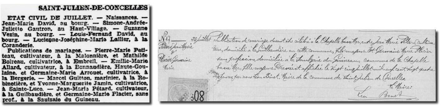 Jean Marie quitte Saint Julien de Concelles un peu à regret le mercredi 6 août 1924. La veille, il a épousé Germaine PLACIER à La Chapelle-Basse-Mer. Germaine, fille d’Armand Placier, sabotier et de Marie Aubert. Il l’a rencontrée un an plus tôt chez des amis communs. Germaine est la troisième de la famille d’une famille de quatre enfants. Elle est née en 1894, cinq ans après sa sœur aînée, Marie Joséphine, religieuse de la communauté de St Gildas. Armand, son frère aîné, est mort à 23 ans en juillet 1918 dans les tranchées de la Marne. Albert, le plus jeune se destine lui aussi aux ordres religieux et est alors au séminaire.