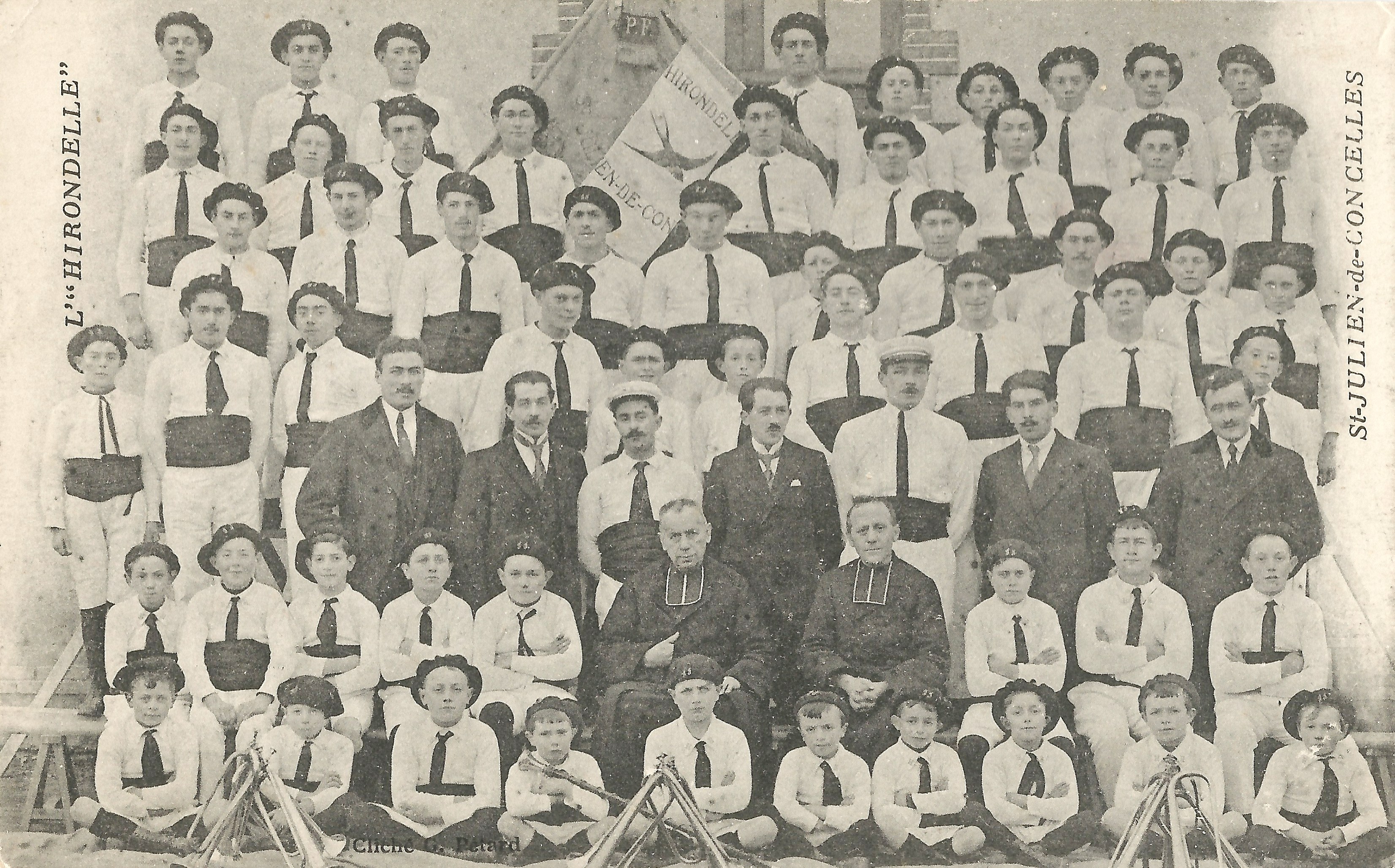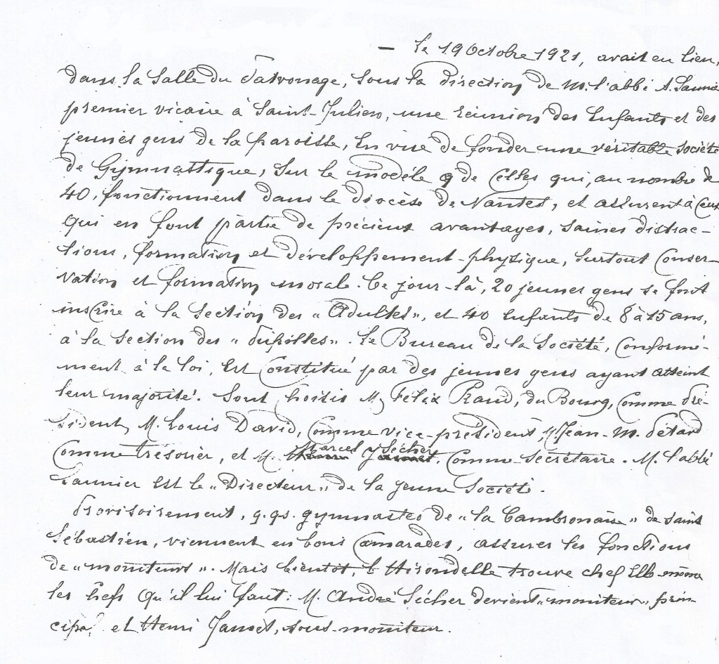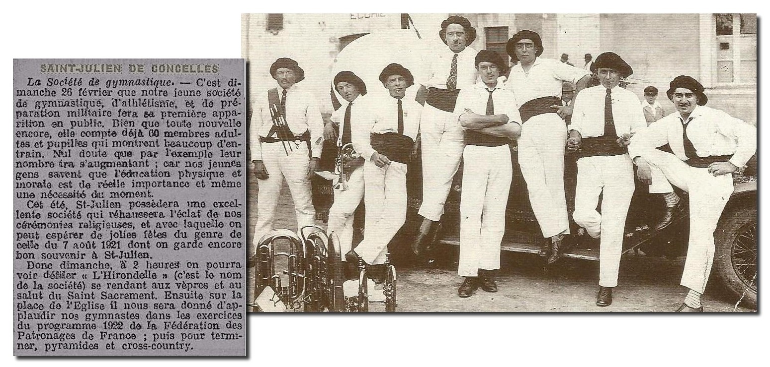 Jeunes ainés des gymnastes de l’Hirondelle dans les années 20. On peut reconnaître parmi eux : Auguste HARROUET, Joseph BADEAU, x, Henri LUZET, Auguste PETARD. Clément PREAUDEAU, x, Lucien LEFEUVRE. Livre Autrefois St Julien- Association ALINEA