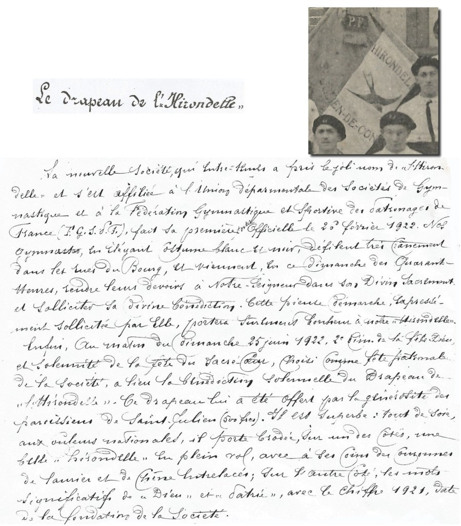 En effet, dès son retour au pays après la guerre, Jean-Marie s’implique avec ses amis et le vicaire Saunier pour créer ensemble la société de gymnastique, autre activité de patronage à côté de la société musicale, du chant et du théâtre.