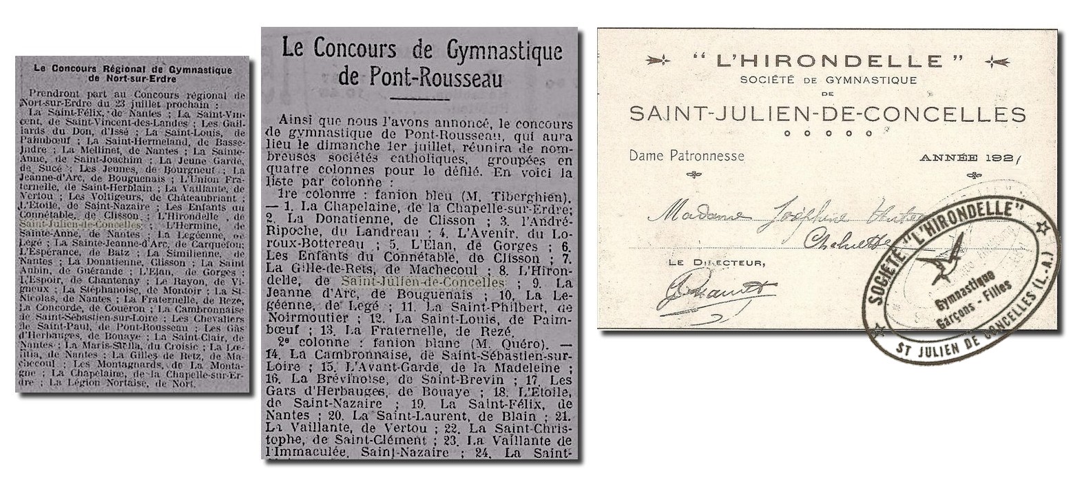 Participer aux festivals de gym et aux concours est l’aboutissement de l’année. La « clique », composée de tambours et de clairons, accompagne le défilé des gymnastes. Sous la conduite d’André SÉCHER et d’Henri JAMET, les deux moniteurs, les jeunes font de savantes pyramides au dessus desquelles les plus légers agitent le drapeau concellois, des mouvements d’ensemble demandant discipline et esprit d’équipe.
