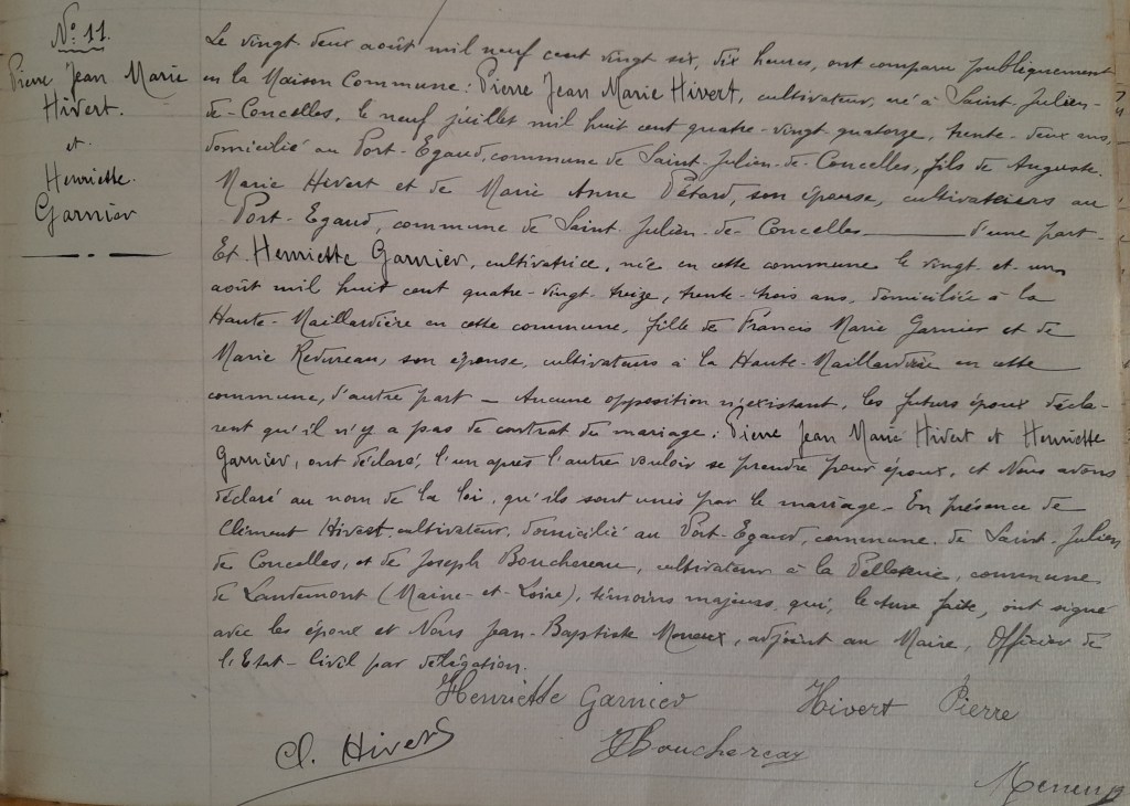 À dix heures tapantes,  familles et amis ont pris rendez-vous à la mairie du Loroux. Les mariés, après avoir échangé leur consentement ont signé le registre municipal avec les deux témoins: Clément, le frère de Pierre et Joseph BOUCHEREAU, l’autre beau-frère d’Henriette.