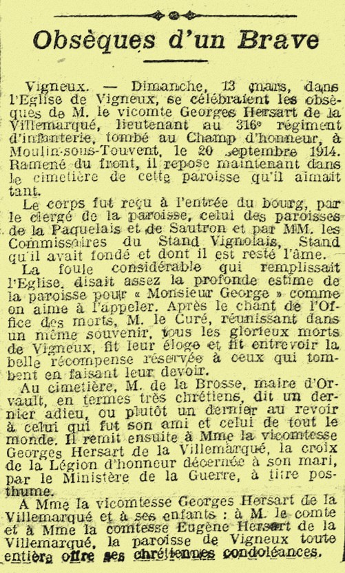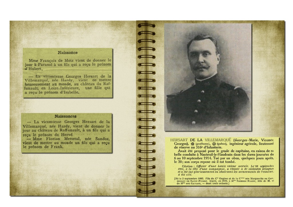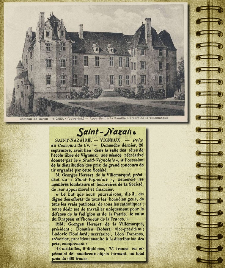 « Suzanne HARDY, ma patronne est devenue Mme HERSART de LA VILLEMARQUE le 7 février 1910 Orvault en épousant Guillaume. La famille HERSART DE LA VILLEMARQUE est très connue en Loire-Inférieure et particulièrement à Vigneux-de-Bretagne. En effet, au 18ème siècle, les HERSART DE LA VILLEMARQUE y firent l’acquisition du Château du Buron, propriété de la Marquise de Sévigné, qui l’avait, elle-même, achetée aux Rohan ».Georges était un fervent catholique, amoureux de l’ordre et de la patrie avec une passion pour les armes à feu et la chose militaire, même s’il exerçait le métier d’ingénieur agricole ».