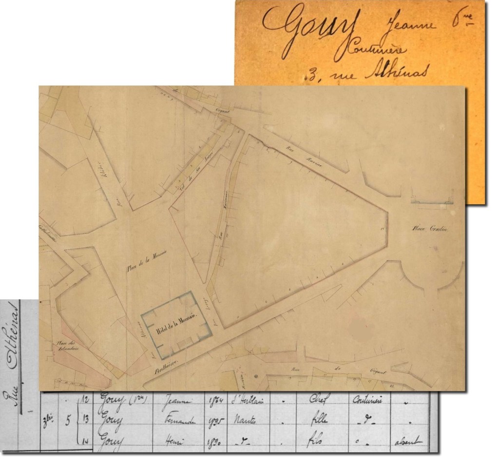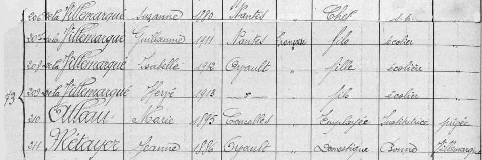 Ce n’est qu’en janvier 1922 que Gabrielle de passage à Nantes découvre pour la première fois le vaste appartement du 16 rue du lycée occupé par la famille HERSART DE VILLEMARQUÉ. Reçue par Marie, elle y croise les 3 enfants, Madame et Jeanne Métayer, « la bonne », « qui était déjà présente avant le mariage de Suzanne au château du Raffuneau » précise Marie.