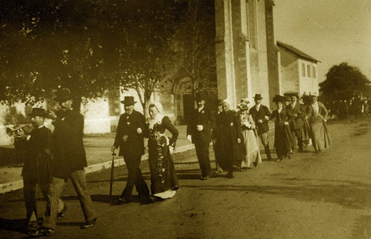 Le 22 octobre 1901, à Thouaré, c’est le mariage de Marie BEZIER, ici au bras de son père et de Joseph BADEAU, au bras de sa mère. Le cortège après la messe suit les musiciens, trompettiste et violoniste.