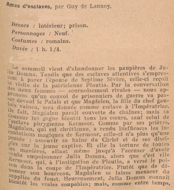 La première pièce choisie s’intitule « Ames d’esclaves » drame en trois actes de Guy de Lannoy. La mixité n’étant pas à l’ordre du jour, les rôles des hommes sont interprétés par les filles. Celles-ci ont également confectionné la plupart des costumes.