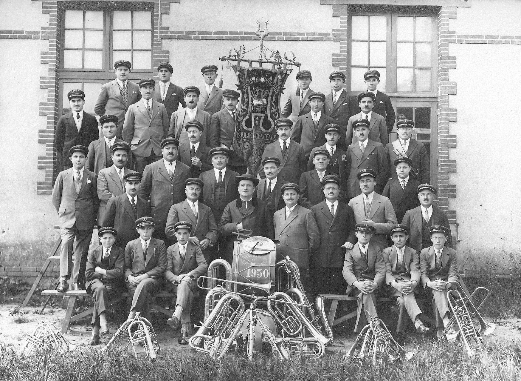Musiciens de l’harmonie concelloise – Photo de Gustave Pétard – De gauche à droite Dernier rang : Henri LUZET, Henri PINIER, Auguste PETARD, Joseph BARTEAU, Clément PREAUDEAU fils, Jean JOUSSEAUME 5ème rang : Lucien LEFEUVRE, Frédéric NOLEAU, Henri Jamet, Joseph PILOQUET, Louis HALLAY, Auguste BRELET 4ème rang : Louis JAMIN, Charles VIAUD Louis DAVID, Marcel TOSSAIN, Félix PRAUD, Auguste ARROUET, 3ème rang : Alex. BATARD, Auguste BRELET, Etienne VIAUD, Alex. CORNET, Baptiste THOMAS, Jean-Marie BOUYER, Camille JEANNEAU 2ème rang : Eugène CORBET, Clément PREAUDEAU, Abbé TISSEAU, Alex. PETARD, Guillaume BRAUD, Marcel SECHER, Adrien ARROUET 1er rang : Benjamin SABLEREAU, Léon VIVANT, Joseph MOSTEAU, Guillaume BRAUD fils, Adrien BATARD, Joseph PIOU