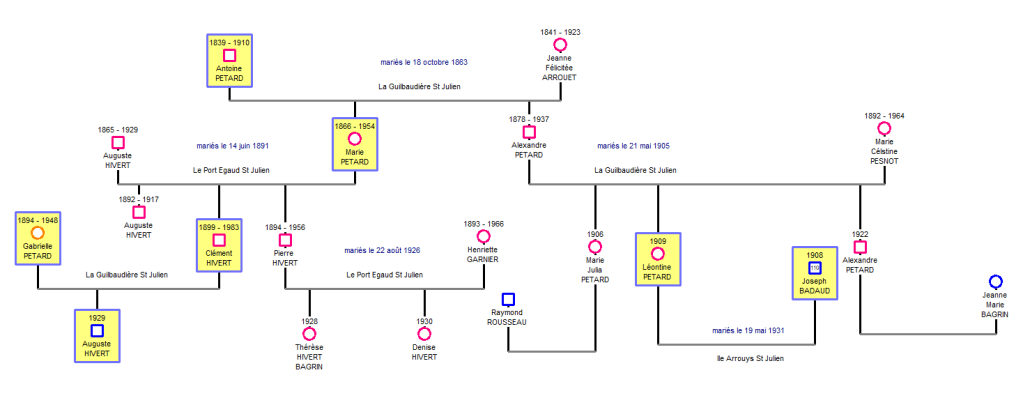 De son côté Léontine a toujours habité la Guilbaudière à Saint Julien. Elle est née en 1909, deuxième de la famille derrière sa sœur Marie Julia, arrivée trois ans plus tôt. Alexandre leur petit frère naît lui en 1922.
