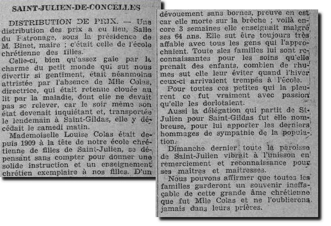 Au mois de juillet 1936, Mademoiselle Louise Colas ne pourra pas assister pas à la distribution de prix de l’école privée des filles marquant la fin du cycle scolaire. Elle est emportée quelques jours plus tard par la maladie.