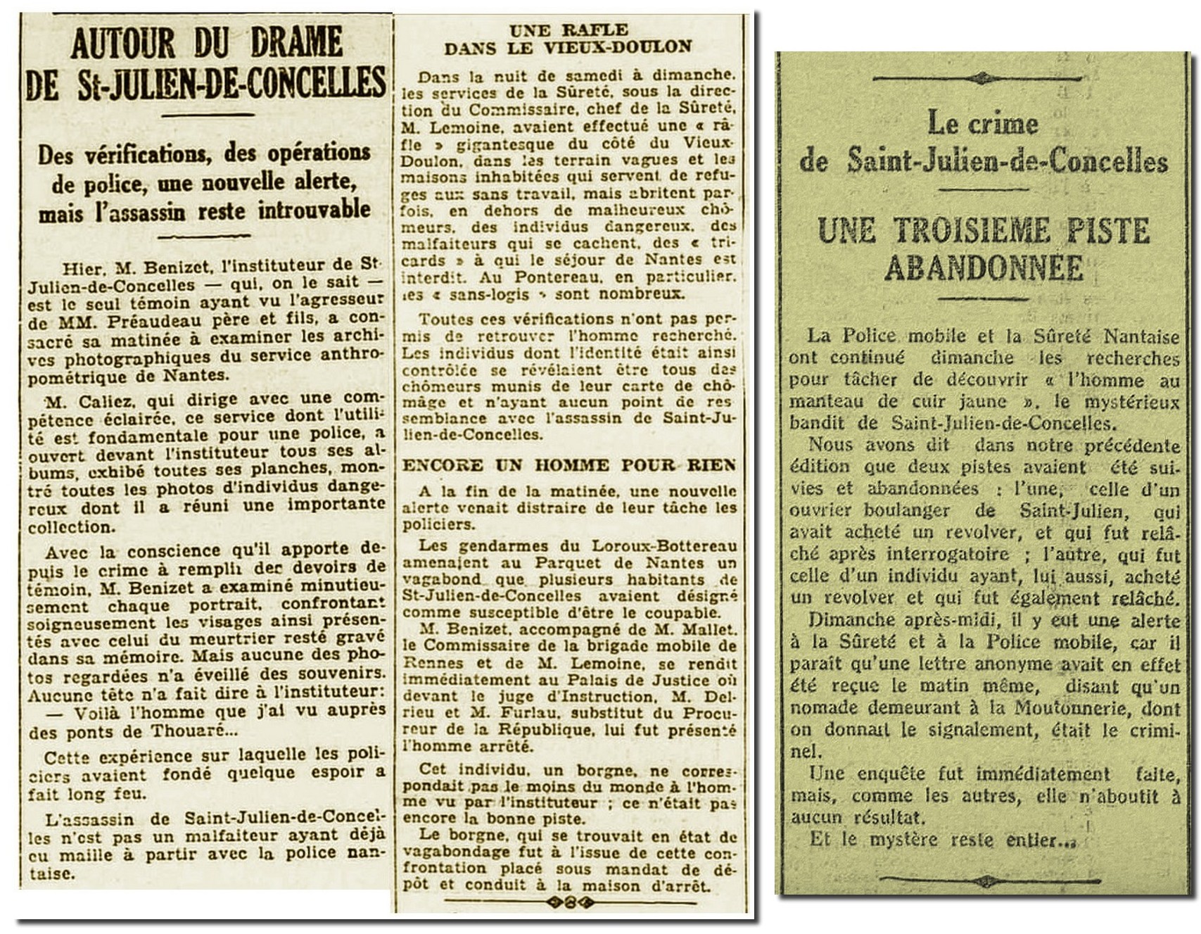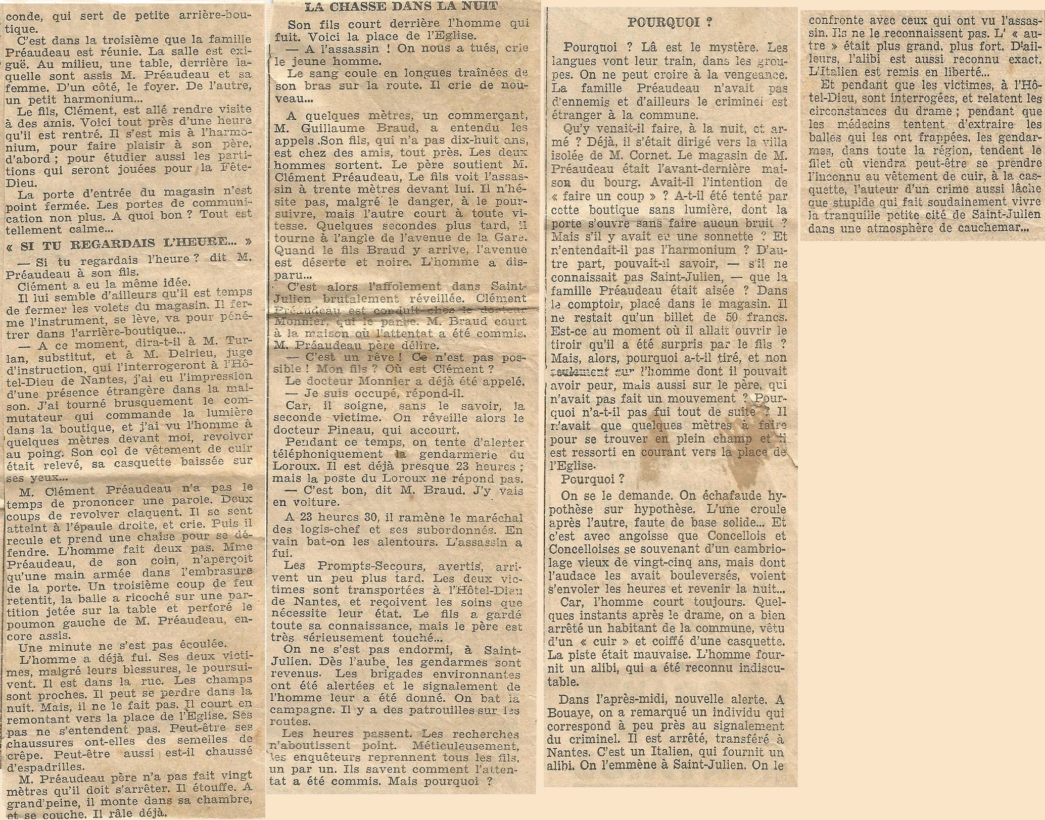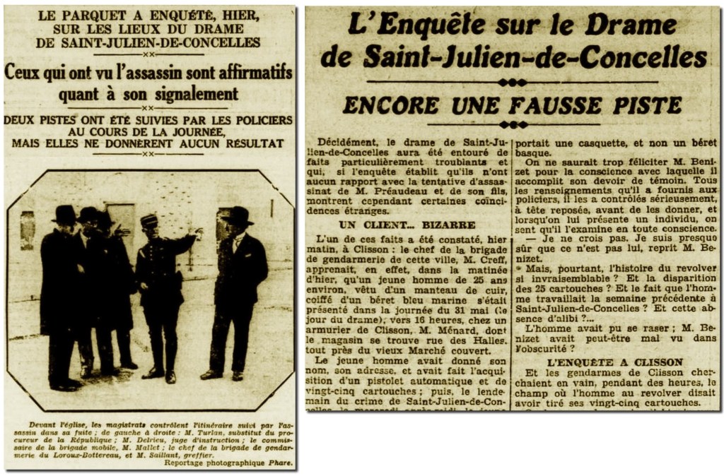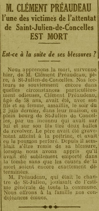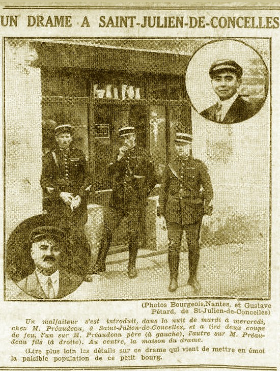 Au début du mois de juin 1932, Saint-Julien-de-Concelles fait la une de l’actualité… Un drame s’est produit rue de la Poste dans la nuit du mardi 31 mai 1932 au domicile de la famille PRÉAUDEAU ; la famille a été violemment agressée par un inconnu avec arme à feu.