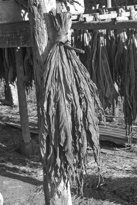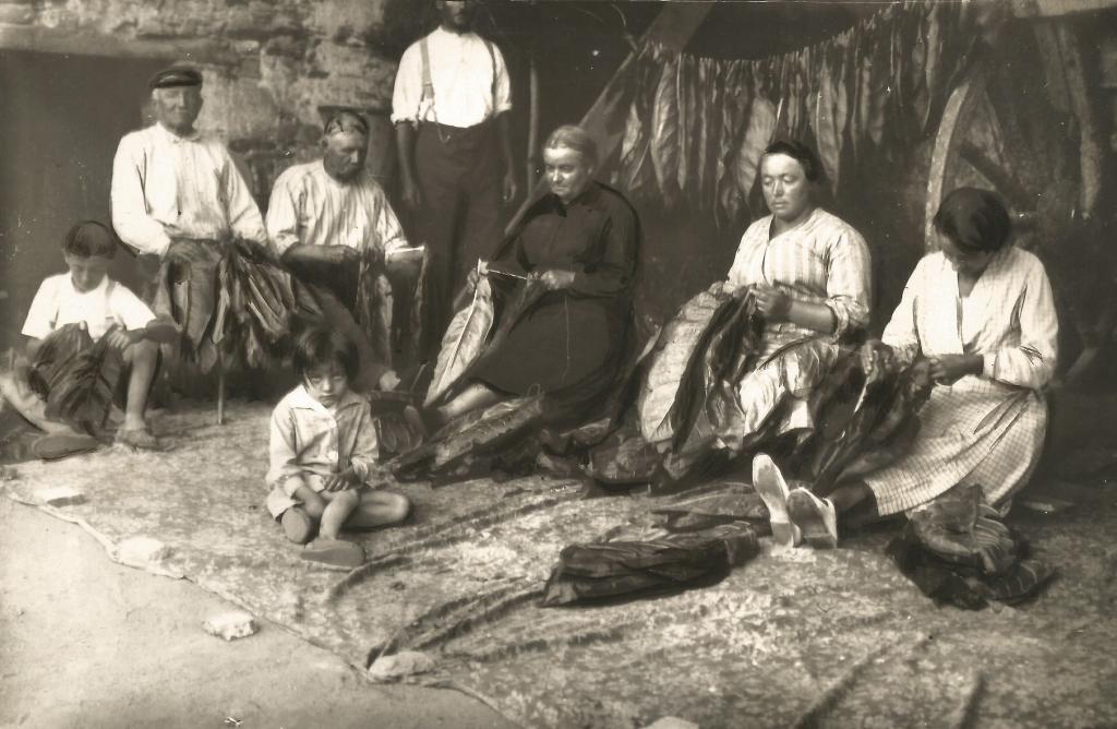 « Débutent ensuite les longues opérations d’enfilage. Une aiguille de 25 cm environ sert à l’enfilage des feuilles sur une ficelle de chanvre pour favoriser le séchage. Les guirlandes de 50 ou 60 feuilles dont la nervure est toujours du même côté sont montées au bout d’un bâton et pendues en équilibre sur un madrier ».