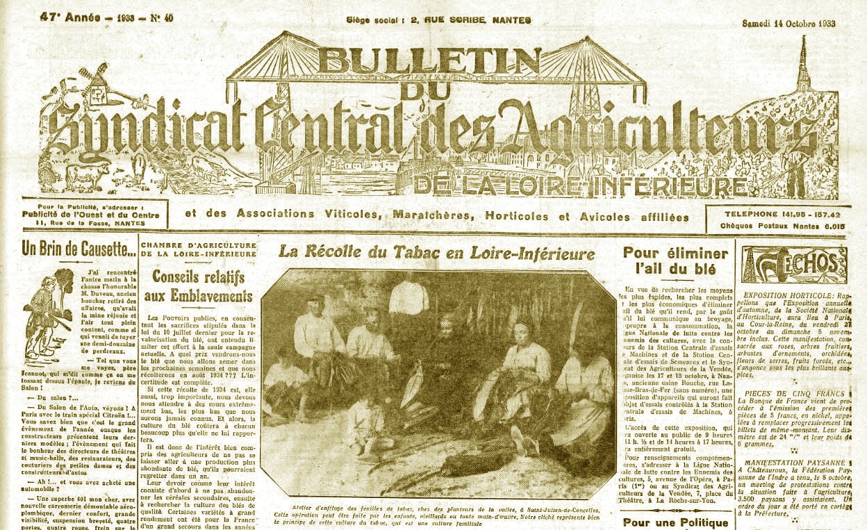 « Pour cette mission toute votre famille doit être mise à contribution » questionne Clément. « En effet » répond Georges en présentant à Clément un ancien journal du syndicat de l’an passé « le journaliste est passé prendre un cliché de la famille lors de l’enfilage des feuilles de tabac en octobre».