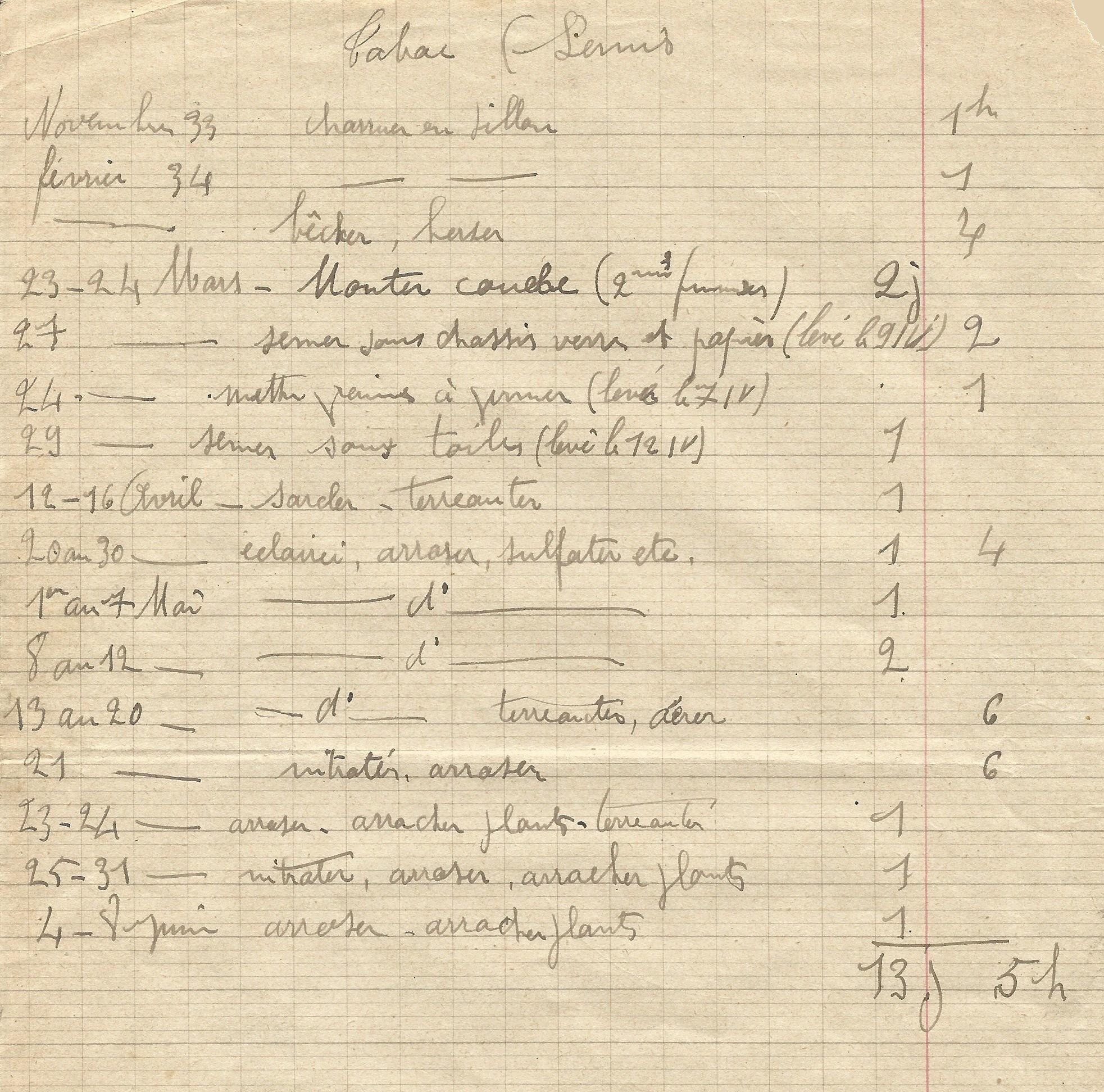 « Deux à trois mois après le semis, vers la fin mai, on effectue la plantation des plants sur une terre préparée. Cette préparation consiste d’abord en un labour profond à l’automne précédent d’un sol abondamment couvert de fumier. Puis, avant la plantation, on ameublit le terrain tout en y ajoutant un peu d’engrais et les insecticides pour détruire les courtilières. Les conseils de traitement de mon ami FAIVRE nous sont précieux en la matière ».
