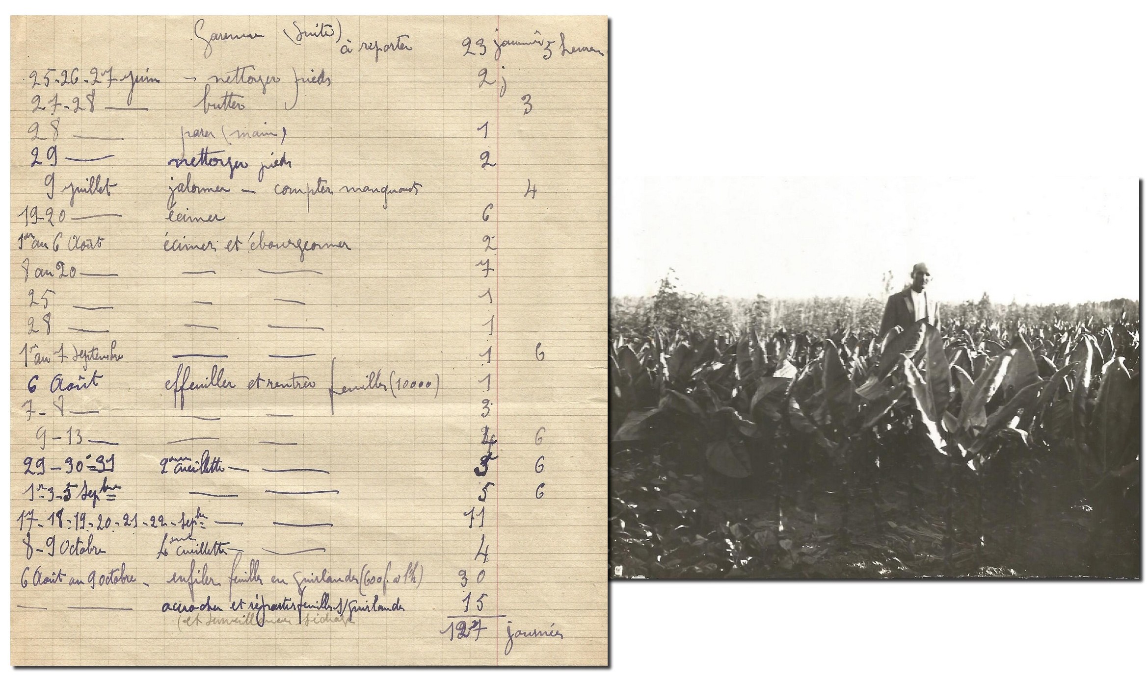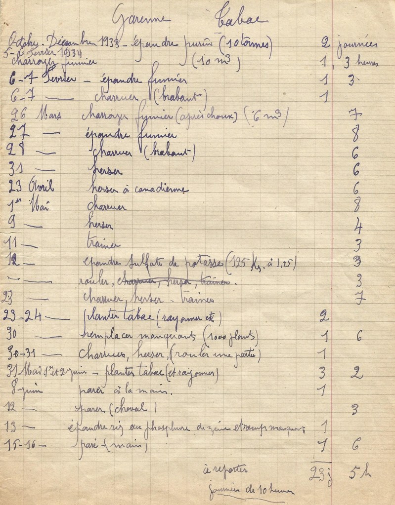 Présentant à Clément un dossier marqué « culture du tabac », Georges poursuit ses explications. « J’ai pu enregistrer l’ensemble des techniques, les tâches et les temps passés pour chaque opération afin d’étudier la rentabilité de cette culture ».