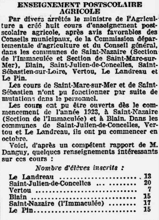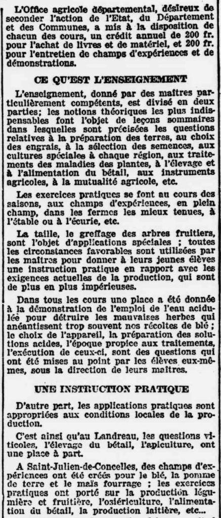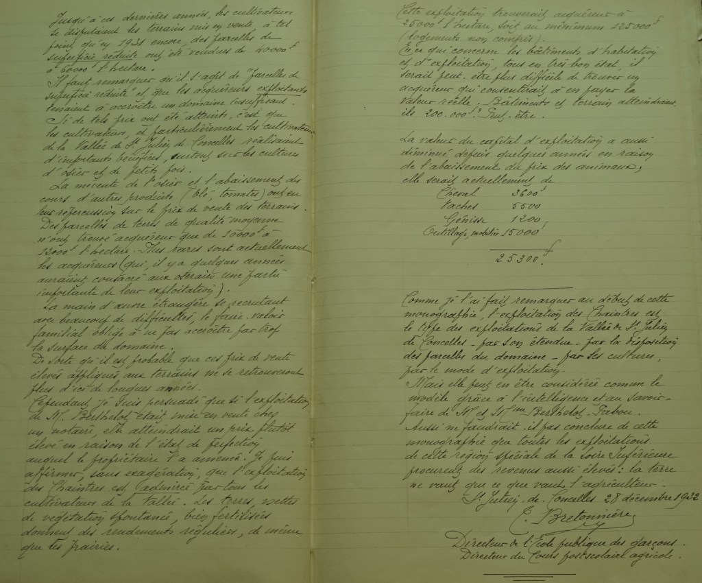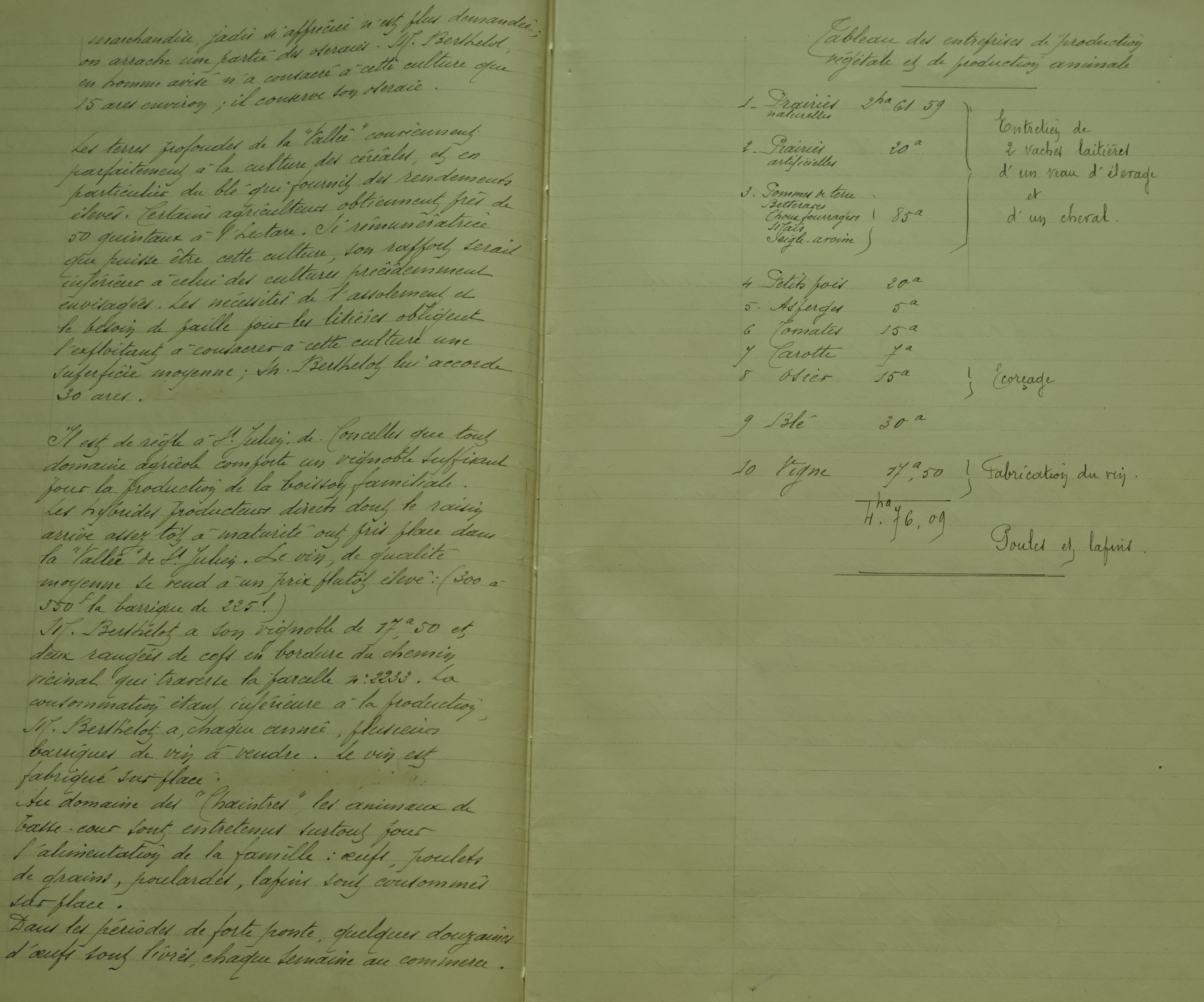 Généralement les exploitants sont pour la plupart propriétaires  et la main d’œuvre étrangère n’intervient que très rarement.C’est dans cette  vallée que se trouve l’exploitation de Monsieur Berthelot-Pabou qui fait le sujet de l’étude qui suit. Par sa superficie la distribution des parcelles,  les méthodes employées, les résultats obtenus,  elle peut-être considérée comme l’exploitation-type de la vallée de Saint-Julien-de- Concelles et sous bien des rapports comme l’exploitation-type de la commune de Saint-Julien-de-Concelles. »
