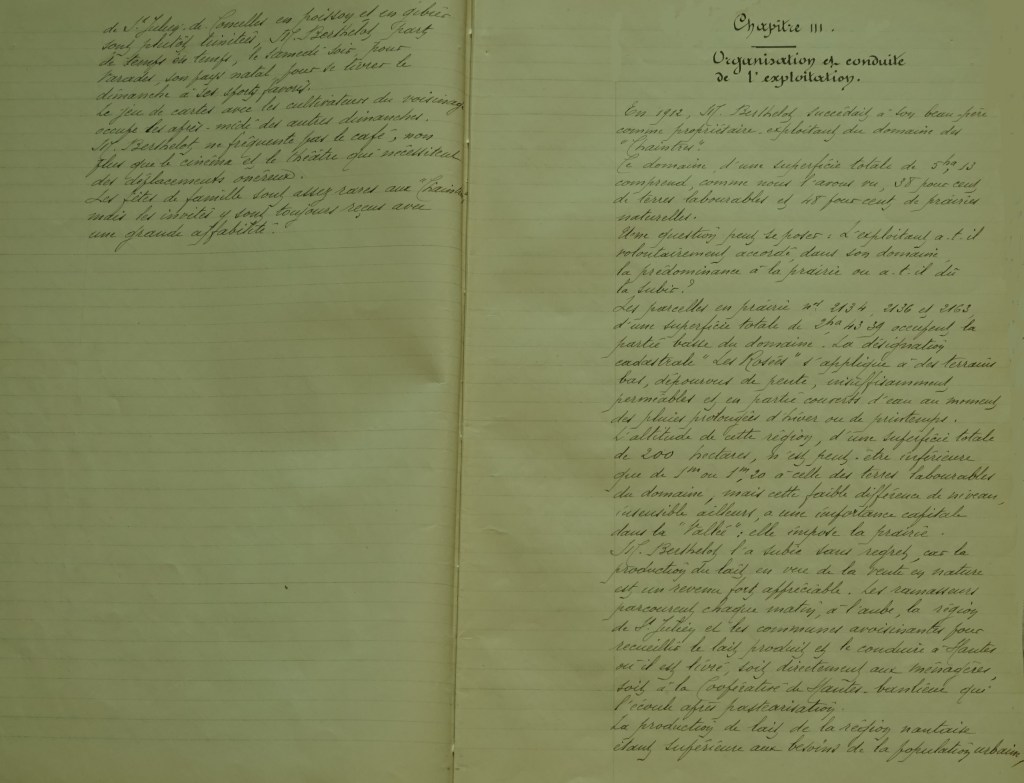 Cette monographie de 80 pages, rédigée avec une belle plume d’instituteur durant ses temps libres dans son manoir de la Crétinière, se présente comme un recueil de bonnes pratiques agricoles. Théophile BRETONNIÈRE souhaite en effet que les jeunes qui assistent à ces cours du soir prennent appui sur des exemples réussis de conduite d’exploitation dans leur environnement proche.