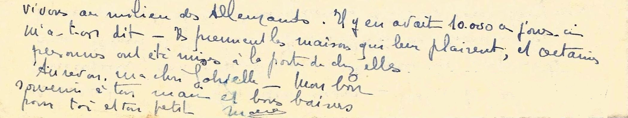 Nous habitons dans un deux-pièces, avenue de la gare, à proximité de l’école ce qui est bien pratique et Henri se rend aussi au travail à pied. Dernièrement nous avons dû cohabiter avec un autre couple de réfugiés en attente d’un logement. Le dimanche Henri prend souvent son vélo pour chercher de l’approvisionnement dans les fermes aux alentours car beaucoup de commerces ici manquent de denrées. Je t’embrasse tendrement ainsi que le petit Auguste. Marie »