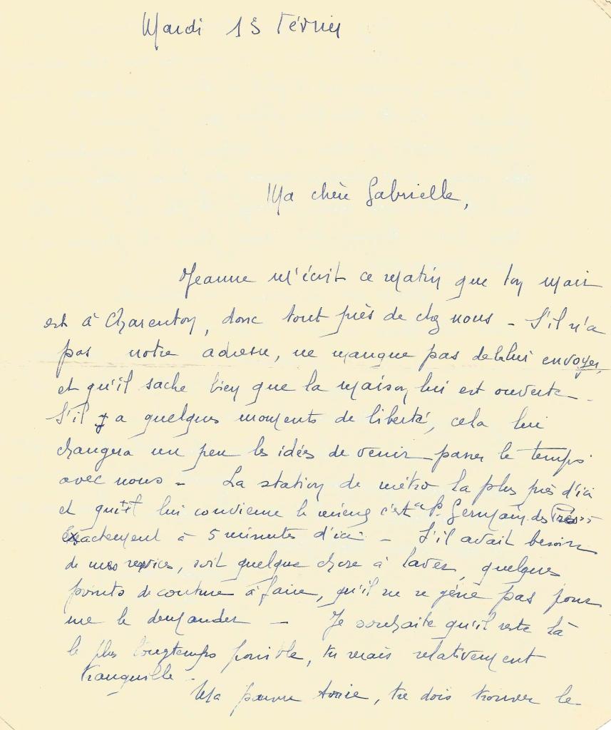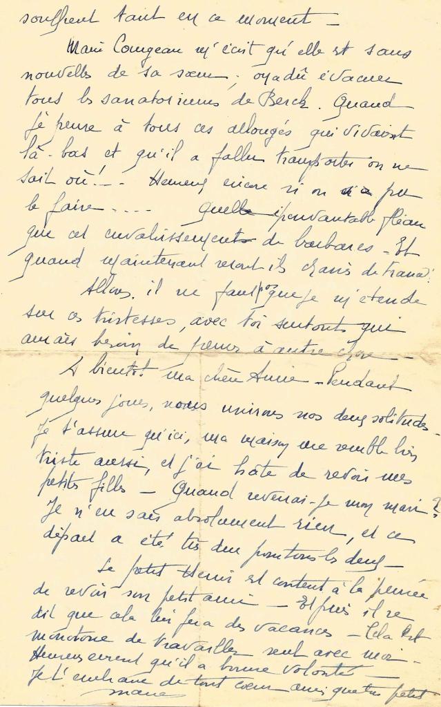 « Ma chère amie Gabrielle, Si j’étais seule, je partirais ce soir pour Saint-Julien car il m’est douloureux, très douloureux de ne pouvoir être près de toi en cette triste circonstance. Mais je n’ai personne à qui confier Henri et comme fait exprès, ses souliers avec lesquels il peut convenablement circuler en ce moment sont en réparation. Soit assurée ma chère Gabrielle que je suis près de toi de cœur et que ta peine est partagée », écrit Marie Gouy ce même jour car elle séjourne au Pouliguen fuyant l’invasion probable de Paris par les Allemands.