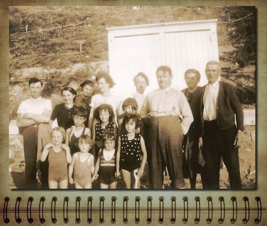 Mimi B. : « Avant la guerre on allait en vacances l’été à Tharon. Ici on était avec nos cousins BADEAU et les familles PRAUD et LEFEUVRE; Mado P. : « Une grande tante, la sœur de ma grand-mère avait acheté une maison à Tharon si bien que c’était devenu un lieu de rassemblement pour la famille et les amis. Je reconnais sur ce cliché de l’été 1937 au dernier rang : Joseph et Titine BADEAU, Francine PRAUD ma maman et papa Félix avec son béret de travers, Alexandre LUZET et les grands parents LEFEUVRE. Les enfants les plus grands sont Lucien LEFEUVRE, ma sœur Annick et Mimi LUZET et les plus petits Monique et Jean BADEAU, Maurice LEFEUVRE et moi Mado PRAUD avec notre maillot de bain à pois.