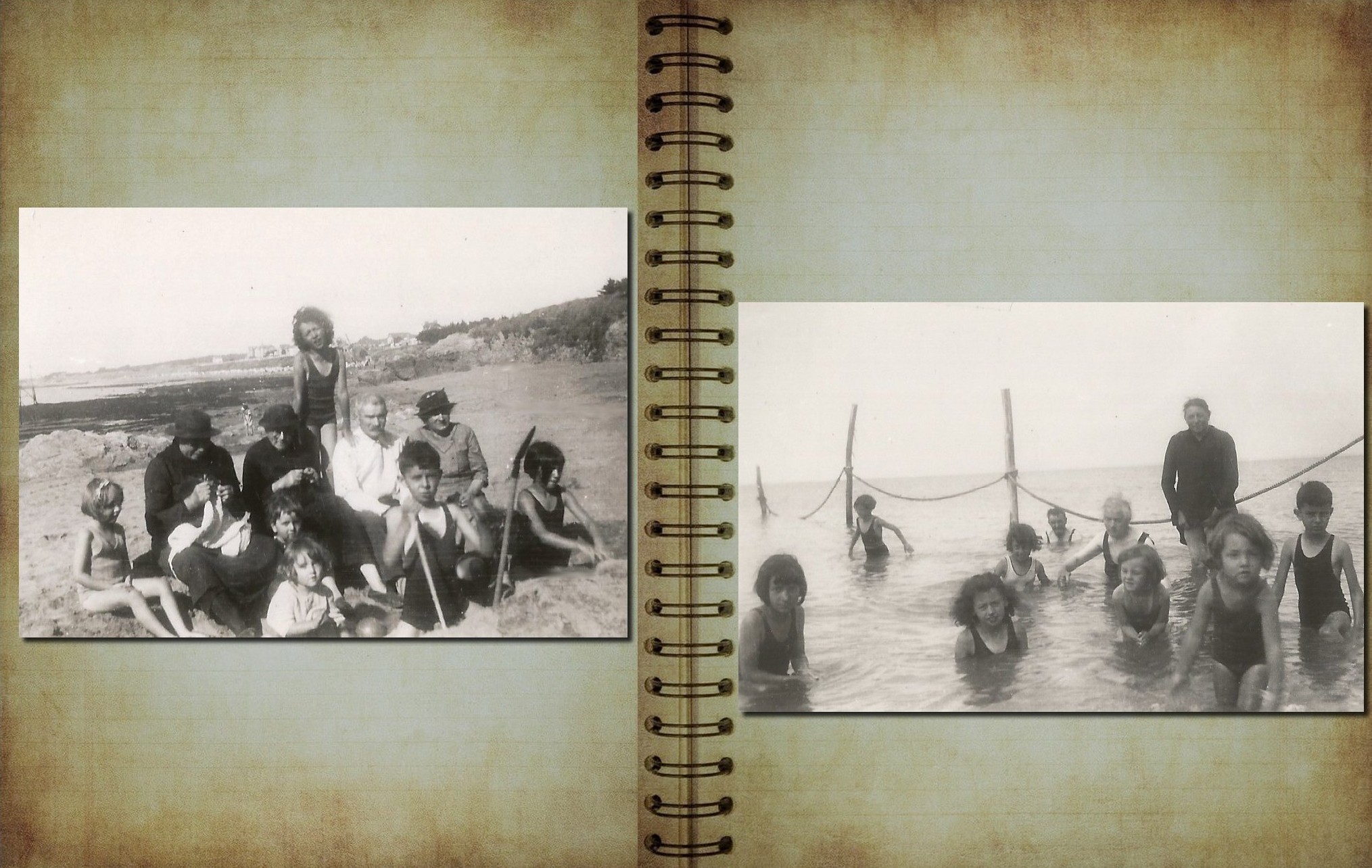 Mado P. : « Pendant que nos parents travaillaient c’était les grands parents qui nous gardaient. Sur la photo de droite je reconnais la grand-mère BADEAU, la grand-mère PRAUD et les grands parents LEFEUVRE. De gauche à droite sur le sable, on distingue Monique et Jean BADEAU, derrière lui Maurice LEFEUVRE et Lucien, son frère ainé avec la pelle et Mimi LUZET. Ma sœur Annick PRAUD est debout derrière. Sur la photo de droite, on voit au premier plan Mimi LUZET ma sœur Annick, Jean et Monique BADEAU, Lucien LEFEUVRE. Je suis à côté au second plan à côté de ma grand-mère PRAUD et devant le grand-père PRAUD plus loin. A côté la grand-mère BADEAU avec sa robe remontée.