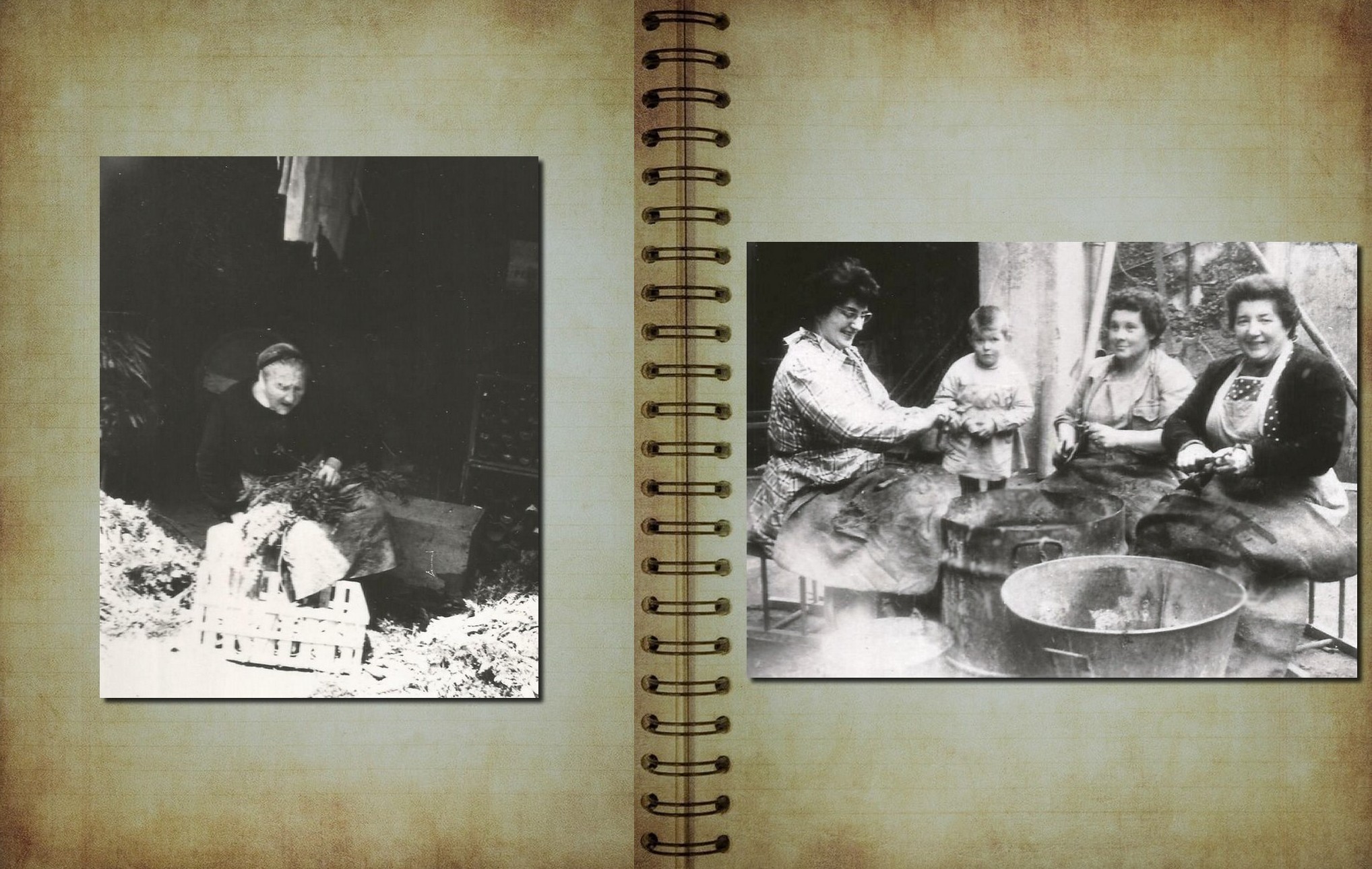 Mimi P. : « Notre grand-mère Eugénie LUZET qui habitait au village des Violettes venait presque tous les jours à pied aider au restaurant. Ici elle plume les poulets ». Mimi B. : « Je suis près de maman à gauche sur la photo. Notre travail du vendredi consistait à éplucher les grenouilles pour les servir en cuisses au beurre aillé le week-end ».