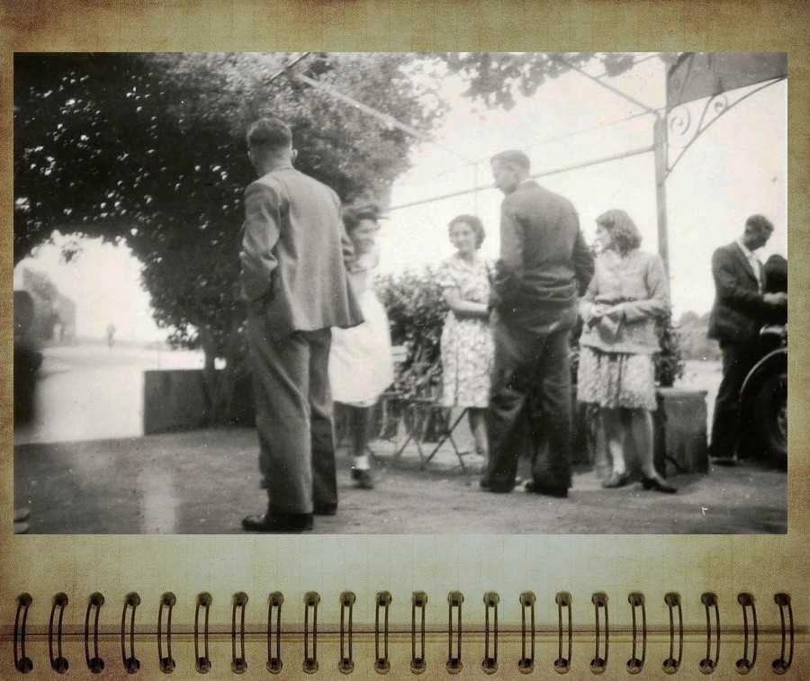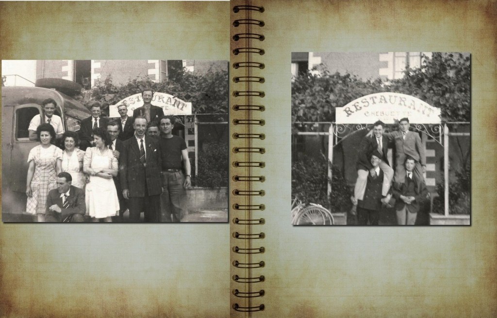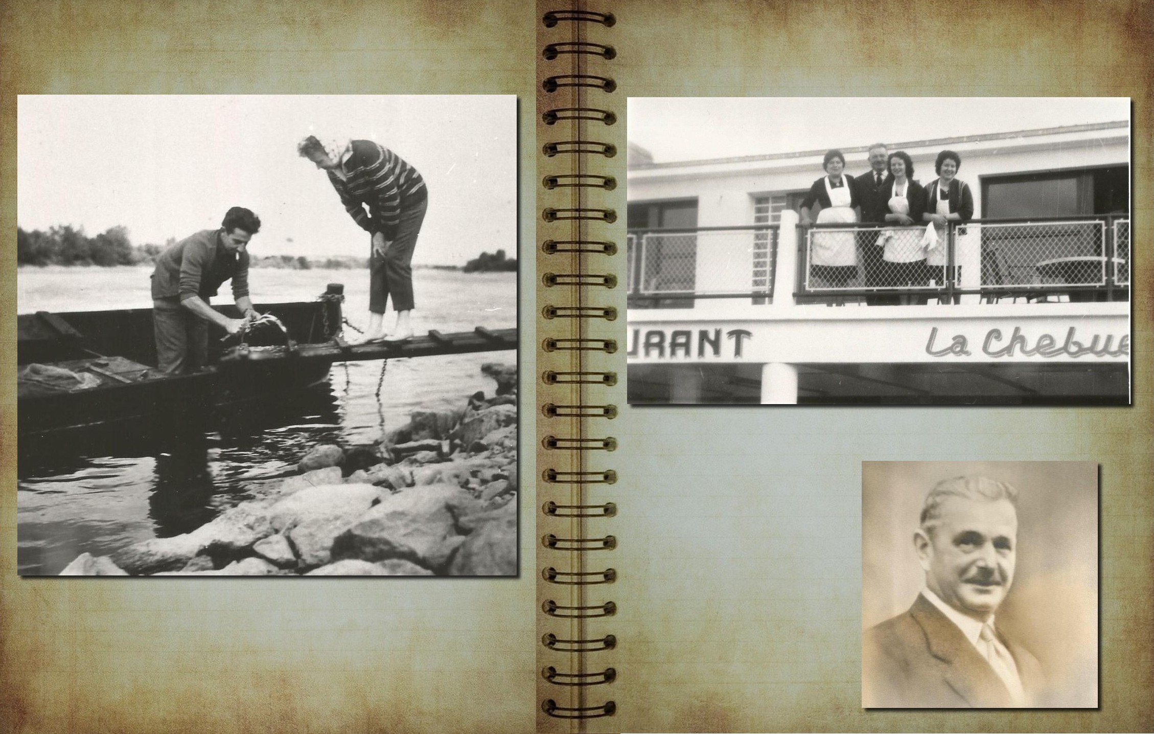 Mimi B. : « Pour préparer le poisson, on avait un petit vivier sur le bord de Loire, face au restaurant. Ici sur la photo de gauche on voit mon mari André BOUQUET en train de préparer un poisson. Mimi P. : « Le restaurant marchait bien et attirait beaucoup de monde… Ici à droite, mon oncle avec trois serveuses sur la terrasse haute du restaurant construite au début des années 1960. Alexandre qui était aussi mon parrain est mort subitement lors d’un voyage en Italie, à Vérone en avril 1965. Il avait 67 ans. ».