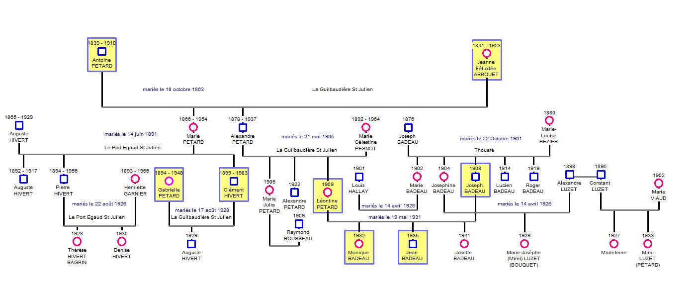 En 1933, une des sœurs aînées de Joseph, Joséphine appelée « Phiphine » reprend, avec son mari Alexandre LUZET, le restaurant HIVERT au village de la Chebuette à Saint Julien face à l’île d’Arrouix Le restaurant BADEAU-LUZET servira de premier relais pour cette île où vit la famille BADEAU coupée de la commune car on n’y accède que par barque (voir récit complémentaire et généalogie PÉTARD-BADEAU ci après).