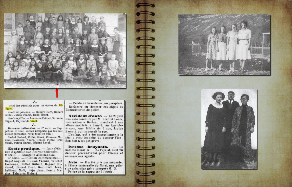 « Ma mère Raymonde fréquenta, après I ‘école Charles Robin de Bourg, l’école communale de Bellignat. Elle s’y révéla très brillante comme en témoignent les appréciations mensuelles particulièrement dithyrambiques de son carnet scolaire ».