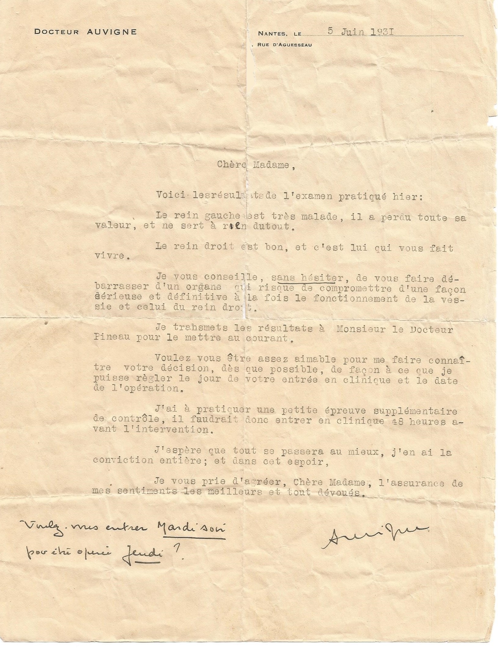 En effet depuis le jeudi 11 juin 1931, Gabrielle a été opérée d’un rein défectueux et ne vivait qu’avec un seul rein.