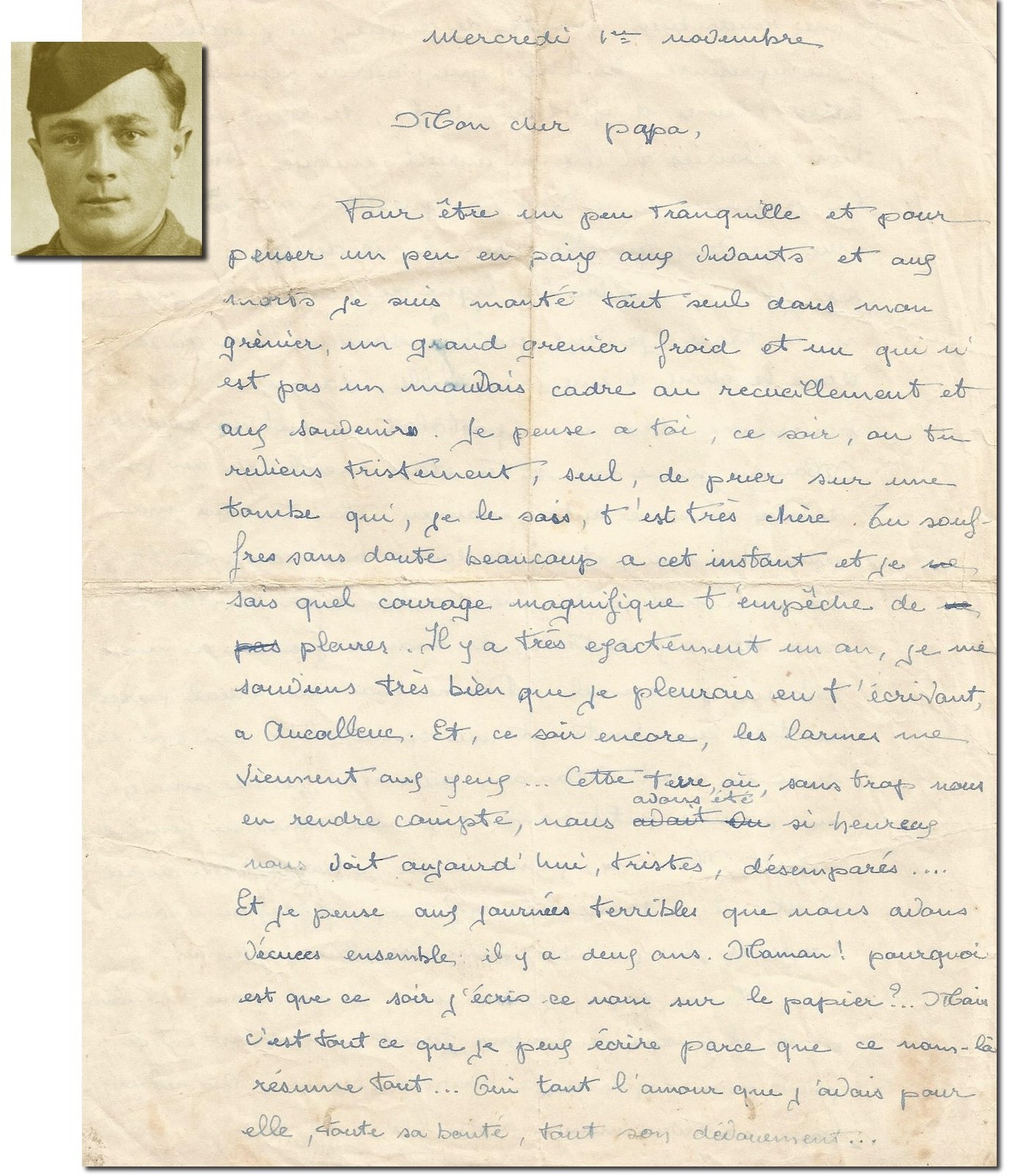 Maman, je ne sais si tu étais meilleure ou plus dévouée qu’une autre maman, mais tu étais ma maman à moi et tu m’as donné beaucoup de ta vie pour moi. Aide-moi à ton tour à donner ma vie aux autres, à moins penser à mon plaisir personnel ! Donne-moi un idéal pareil au tien ! Une bonté, une sensibilité comme toi seule en avait. Maman, aide-moi je ne suis qu’un pauvre petit homme perdu dans un milieu infect. Maman, pense aussi à papa. Lui aussi, il est seul redonne-lui confiance, il souffre encore beaucoup plus que moi. Panse nos plaies Maman.